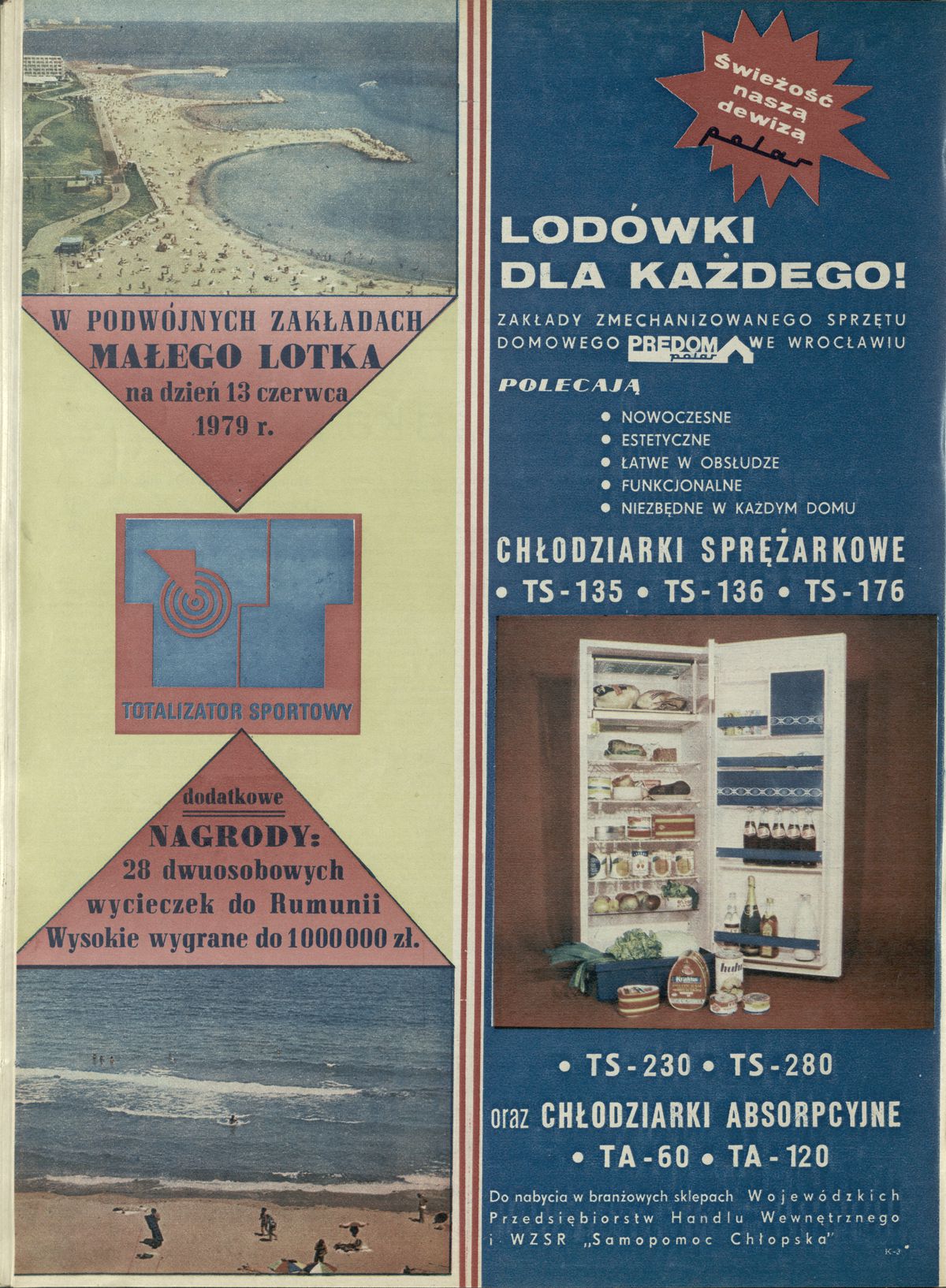 Archiwum / Reklamy nr 1782 (22/1979) 09/11 Podziel się Tytuł Reklamy Rubryka Reklamy Artykuł z numeru 1782 (22/1979) Data wydania 1 czerwca 1979 Tagi Toto Lotek lodówki