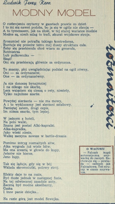 Archiwum / Poezja nr 1784 (24/1979) 985/2007 Podziel się Tytuł Modny model Autor Ludwik Jerzy Kern Kategoria Poezja Artykuł z numeru 1784 (24/1979) Data wydania 17 czerwca 1979
