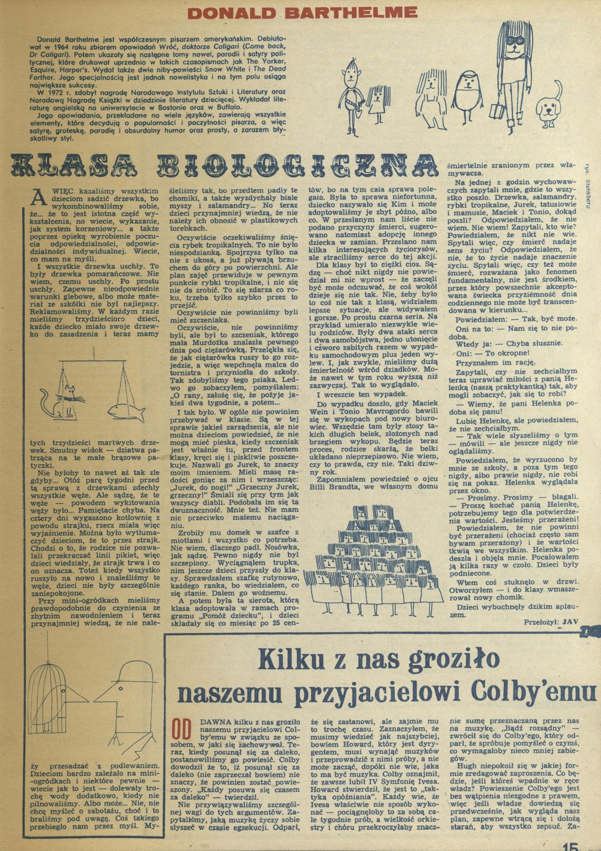 Archiwum / Opowiadanie nr 1772 (12/1979) 81/360 Podziel się Tytuł Klasa biologiczna Autor Donald Barthelme Kategoria Opowiadanie Artykuł z numeru 1772 (12/1979) Data wydania 25 marca 1979