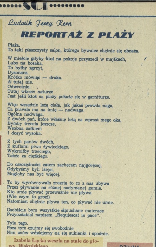 Archiwum / Poezja nr 1786 (26/1979) 40/90 Podziel się Tytuł Reportaż z plaży Autor Ludwik Jerzy Kern Kategoria Poezja Artykuł z numeru 1786 (26/1979) Data wydania 1 lipca 1979