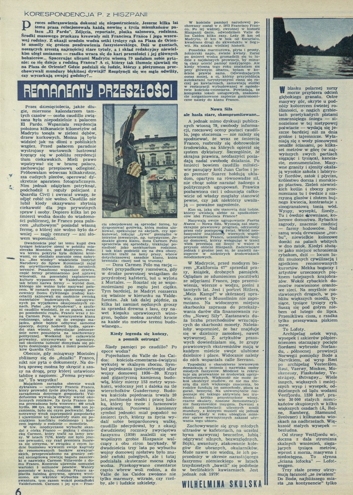 Archiwum / korespondencja własna "Przekroju" nr 1785 (25/1979) 21/317 Podziel się Tytuł Remanenty przeszłości Autor Wilhelmina Skulska Rubryka korespondencja własna "Przekroju" Artykuł z numeru 1785 (25/1979) Data wydania 24 czerwca 1979 Tagi Hiszpania Francisco Franco