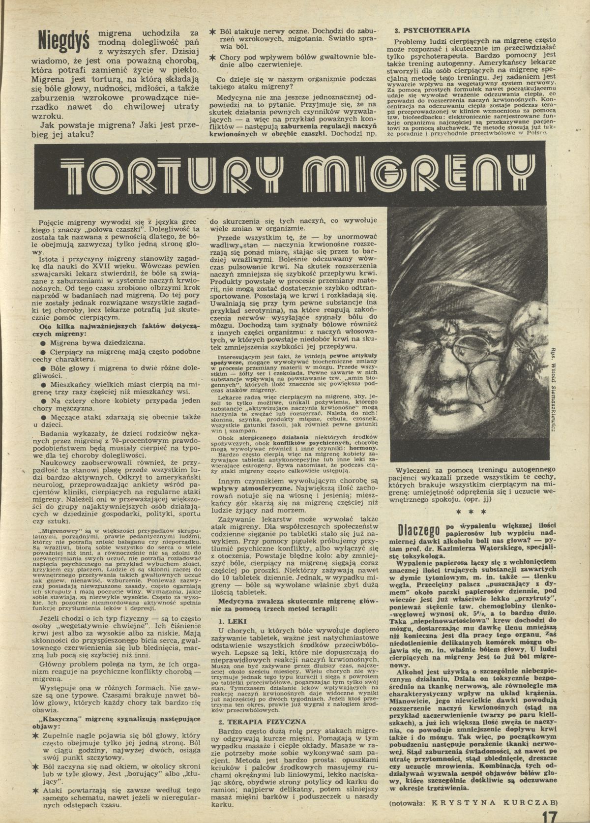 Archiwum / Nauka nr 1788 (28/1979) 74947/123969 Podziel się Tytuł Tortury migreny Autor Krystyna Kurczab Kategoria Nauka Artykuł z numeru 1788 (28/1979) Data wydania 15 lipca 1979 Tagi migrena ból głowy medycyna