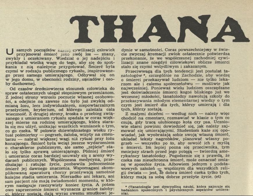 Archiwum / Artykuł nr 1805 (45/1979) 136/161 Podziel się Tytuł Thanatos Kategoria Artykuł Artykuł z numeru 1805 (45/1979) Data wydania 11 listopada 1979 Tagi śmierć