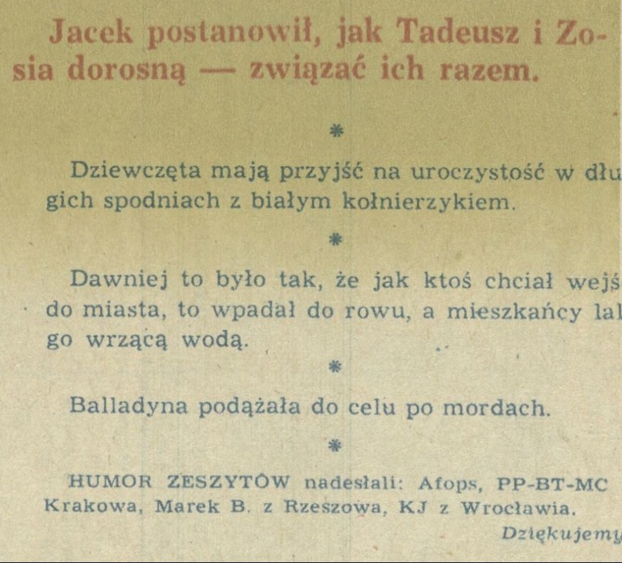 Archiwum / Humor zeszytów szkolnych nr 1805 (45/1979) 313/317 Podziel się Tytuł Humor zeszytów Rubryka Humor zeszytów szkolnych Artykuł z numeru 1805 (45/1979) Data wydania 11 listopada 1979 Tagi Pan Tadeusz Balladyna