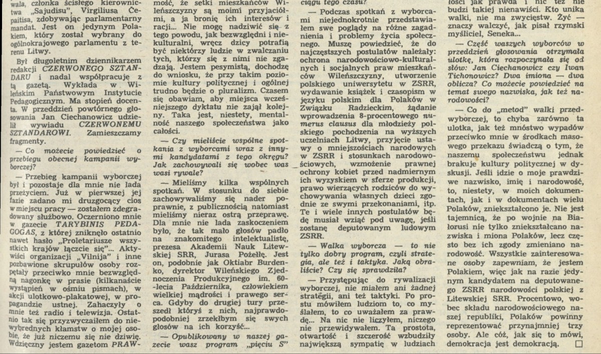 Archiwum / Relacja nr 2291 (19/1989) 10/31 Podziel się Tytuł Jestem jedynym Polakiem Autor Jan Ciechanowicz Kategoria Relacja Artykuł z numeru 2291 (19/1989) Data wydania 7 maja 1989 Tagi pieriestrojka Rada Najwyższa ZSRR Jan Ciechanowicz