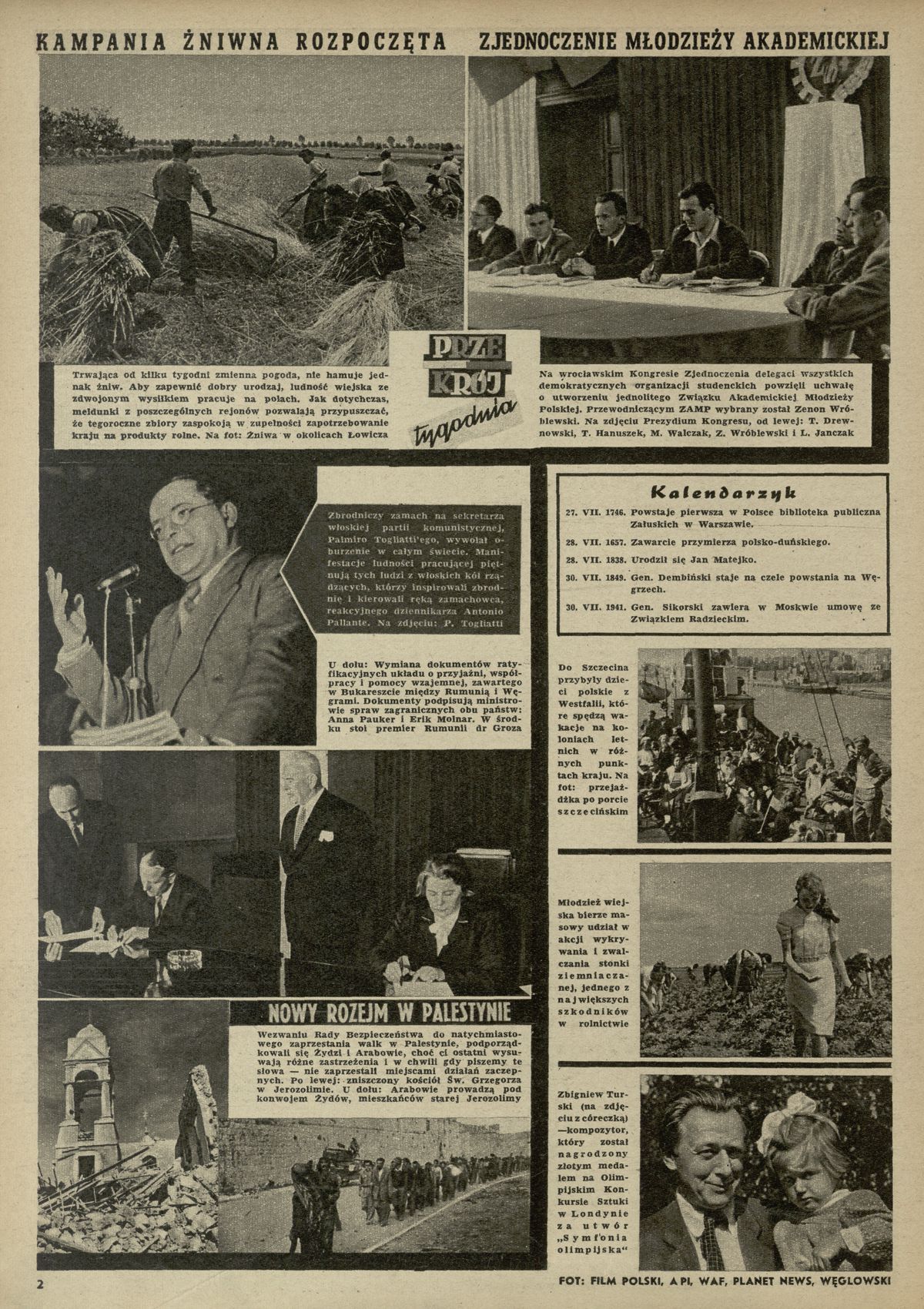 Archiwum / Przekrój tygodnia nr 172 (30/1948) 172/3219 Podziel się Tytuł Przekrój tygodnia Rubryka Przekrój tygodnia Artykuł z numeru 172 (30/1948) Data wydania 25 lipca 1948 Tagi żniwa kongres zamach Palestyna