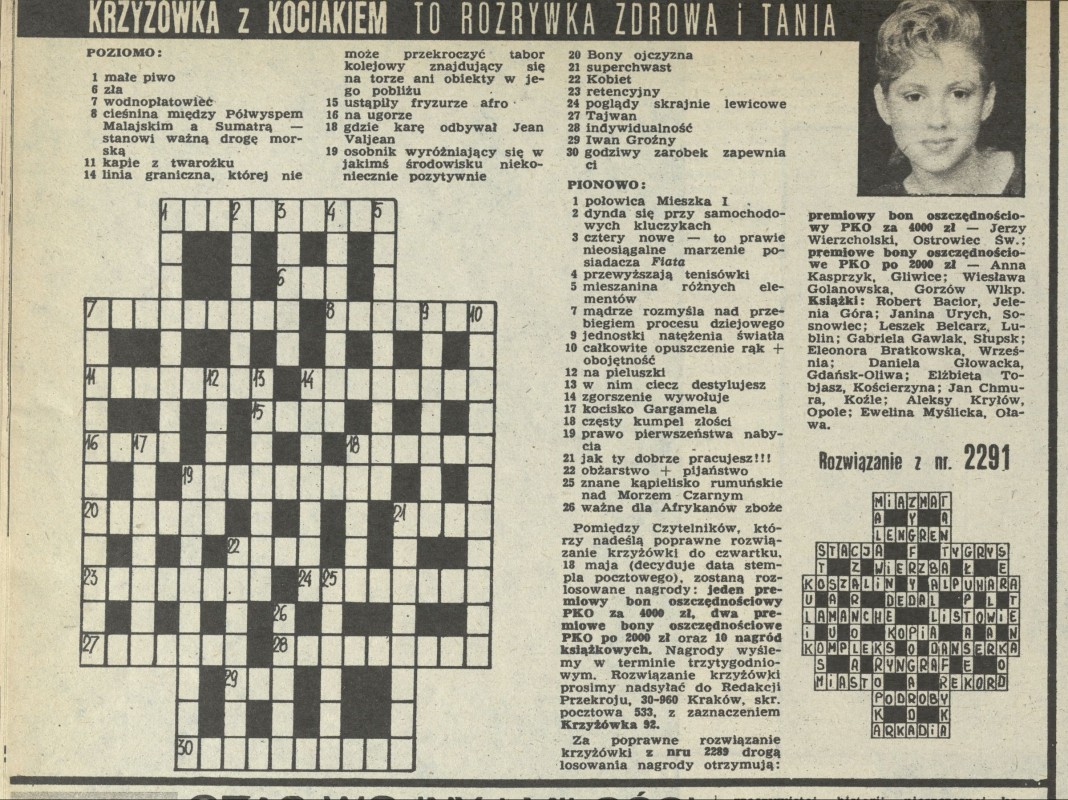 Archiwum / Krzyżówka z kociakiem nr 2292 (20/1989) 33/88 Podziel się Tytuł Krzyżówka z kociakiem Rubryka Krzyżówka z kociakiem Artykuł z numeru 2292 (20/1989) Data wydania 14 maja 1989 Tagi krzyżówka z kociakiem