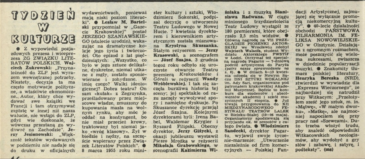 Archiwum / Tydzień w kulturze nr 2127 (11/1986) 233/855 Podziel się Tytuł Tydzień w kulturze Autor ms Rubryka Tydzień w kulturze Artykuł z numeru 2127 (11/1986) Data wydania 16 marca 1986