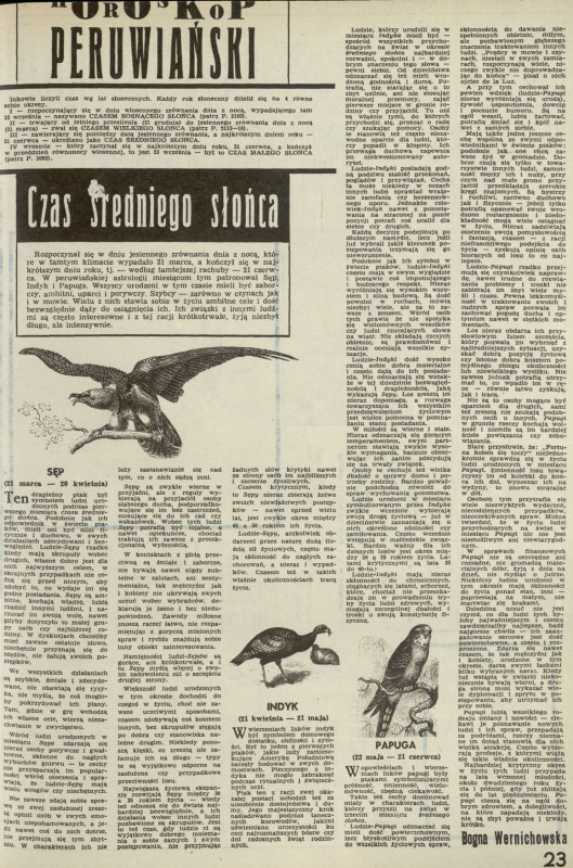 Archiwum / Rozrywka nr 2128 (12/1986) 09/10 Podziel się Tytuł Horoskop peruwiański Autor Bogna Wernichowska Kategoria Rozrywka Artykuł z numeru 2128 (12/1986) Data wydania 23 marca 1986 Tagi horoskop inkowie