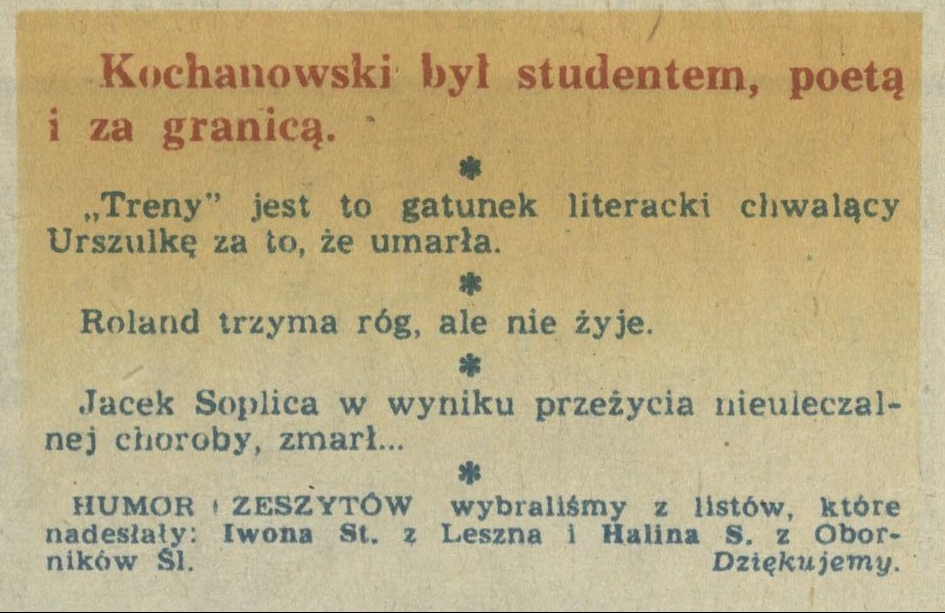 Archiwum / Humor zeszytów szkolnych nr 1808 (48/1979) 75734/123969 Podziel się Tytuł Humor zeszytów Rubryka Humor zeszytów szkolnych Artykuł z numeru 1808 (48/1979) Data wydania 2 grudnia 1979