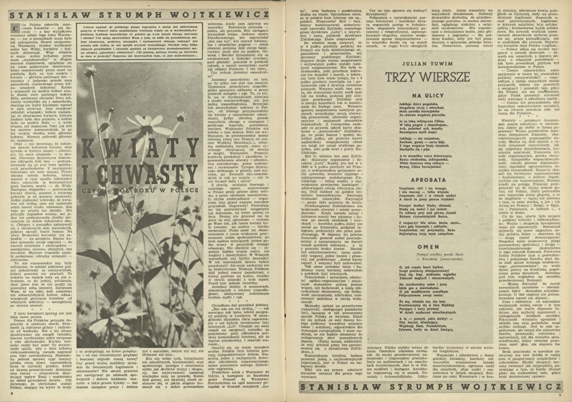 Archiwum / Społeczeństwo nr 73 (35/1946) 54/1434 Podziel się Tytuł Kwiaty i chwasty czyli pół roku w Polsce Autor Stanisław Strumph Wojtkiewicz Kategoria Społeczeństwo Artykuł z numeru 73 (35/1946) Data wydania 1 września 1946 Tagi Polska społeczeństwo naród opinie wojna