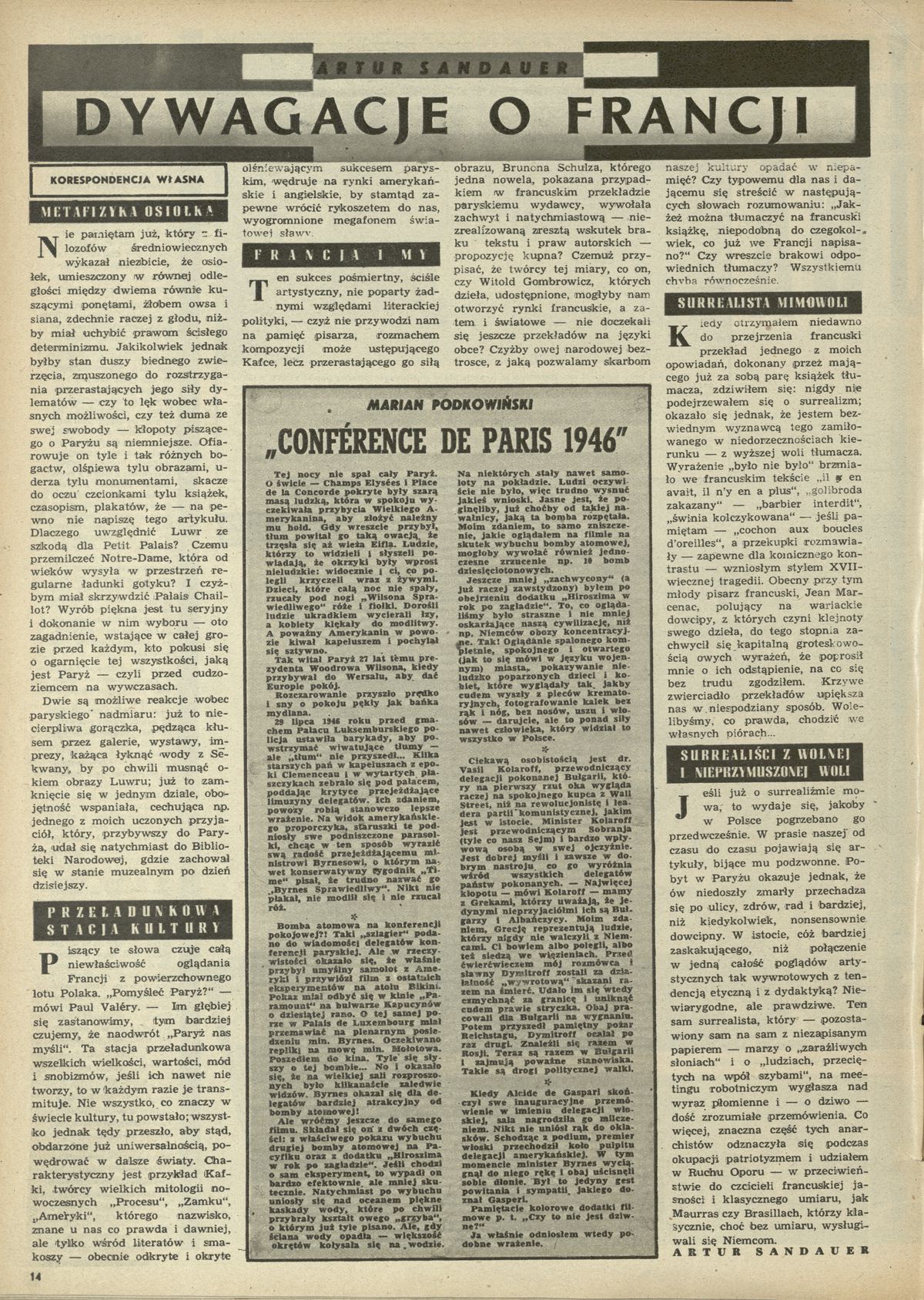 Archiwum / korespondencja własna "Przekroju" nr 73 (35/1946) 18/613 Podziel się Tytuł Dywagacje o Francji Autor Artur Sandauer Rubryka korespondencja własna "Przekroju" Artykuł z numeru 73 (35/1946) Data wydania 1 września 1946 Tagi Francja Paryż francuski