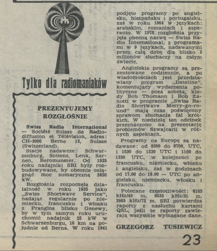 Archiwum / Różności nr 2300 (28/1989) 121/423 Podziel się Tytuł Tylko dla radiomaniaków Autor Grzegorz Tusiewicz Kategoria Różności Artykuł z numeru 2300 (28/1989) Data wydania 9 lipca 1989 Tagi radio Swiss Radio International