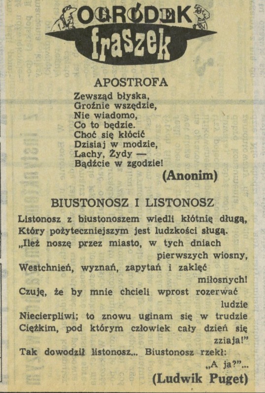 Archiwum / Poezja nr 2300 (28/1989) 03/28 Podziel się Tytuł Ogródek fraszek Kategoria Poezja Artykuł z numeru 2300 (28/1989) Data wydania 9 lipca 1989 Tagi ogródek fraszek