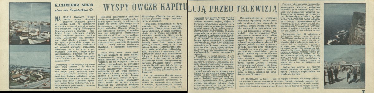 Archiwum / korespondencja własna "Przekroju" nr 1820 (08/1980) 47714/123969 Podziel się Tytuł Wyspy Owcze kapitulują przed telewizją Autor Kazimierz Seko Rubryka korespondencja własna "Przekroju" Artykuł z numeru 1820 (8/1980) Data wydania 24 lutego 1980