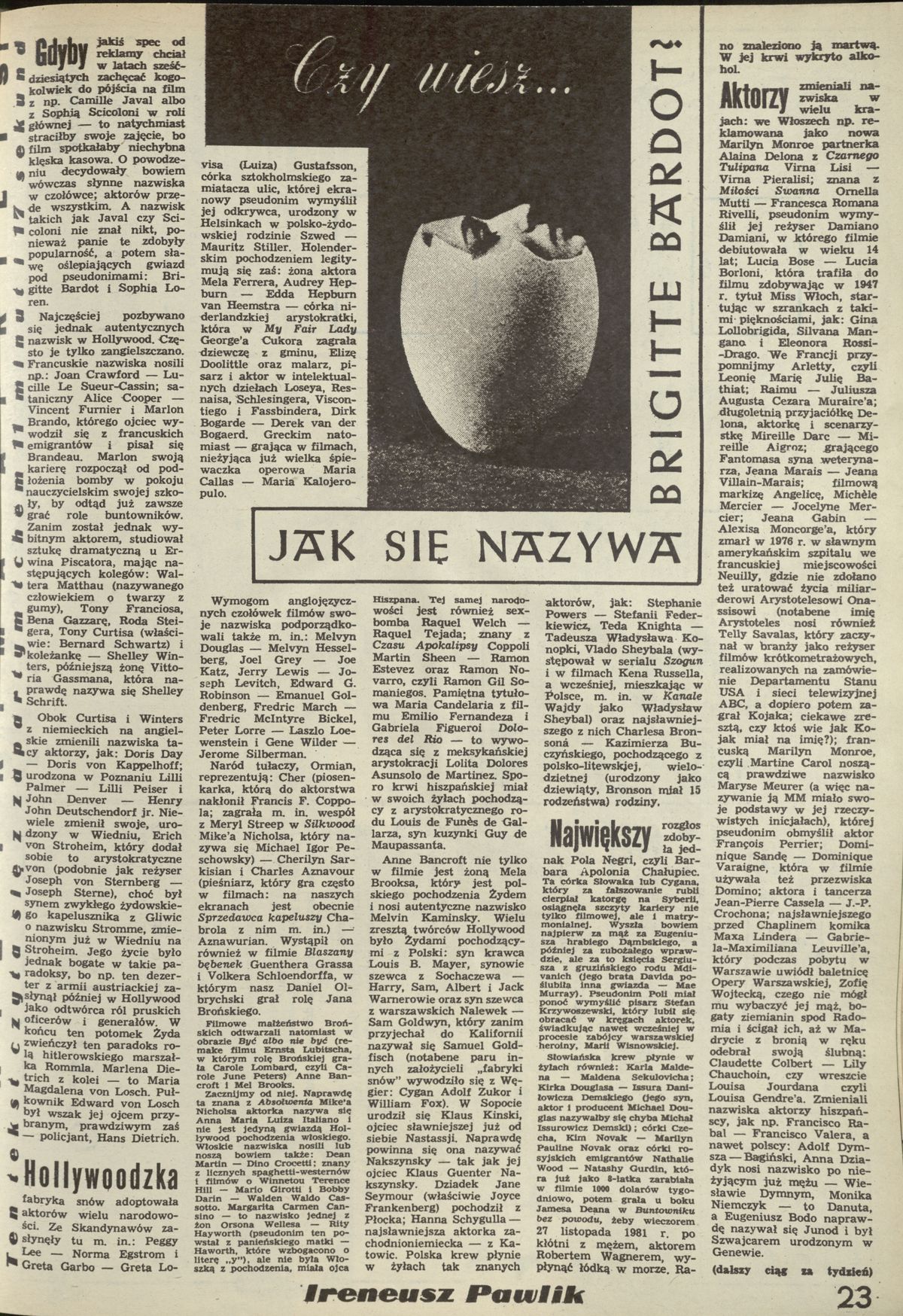 Archiwum / Kultura nr 2129 (13/1986) 2/5 Podziel się Tytuł Jak się nazywa Brigitte Bardot? Autor Ireneusz Pawlik Kategoria Kultura Artykuł z numeru 2129 (13/1986) Data wydania 30 marca 1986 Tagi aktorzy