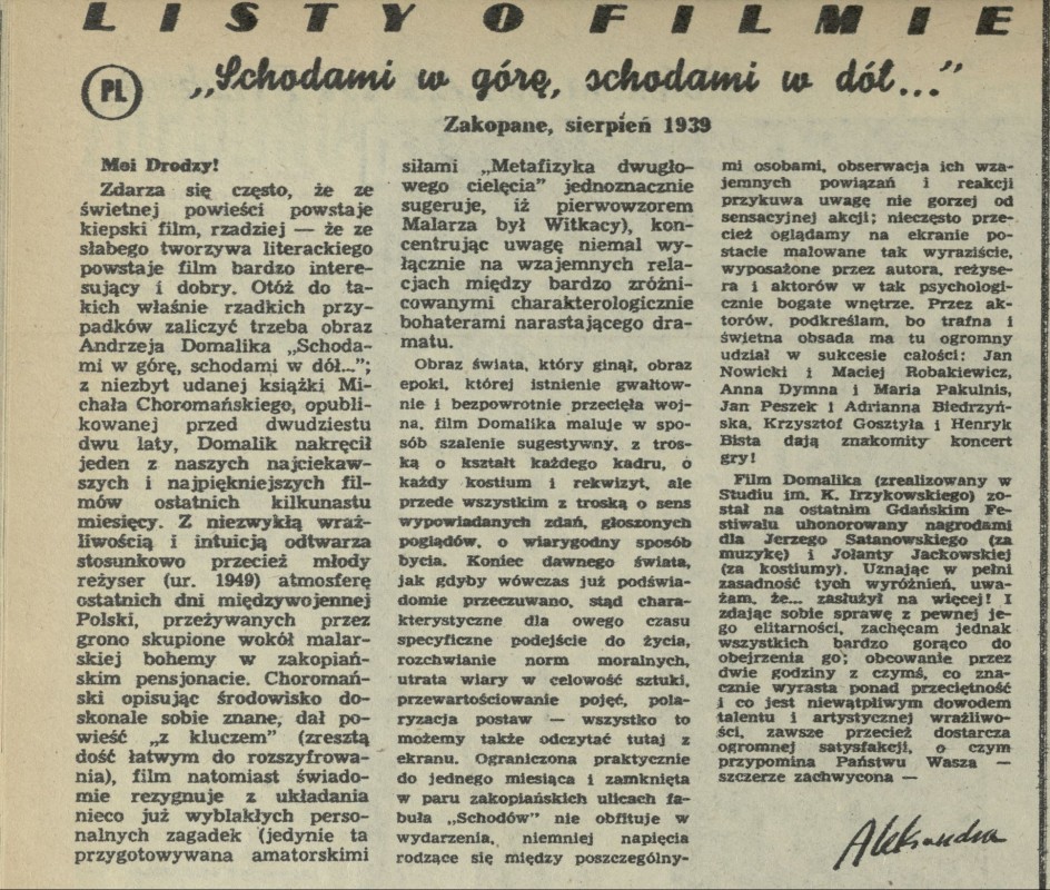 Archiwum / Listy o filmie nr 2304 (32/1989) 333/342 Podziel się Tytuł Listy o filmie Autor Aleksandra Rubryka Listy o filmie Artykuł z numeru 2304 (32/1989) Data wydania 6 sierpnia 1989 Tagi Schodami w górę schodami w doł Witkacy