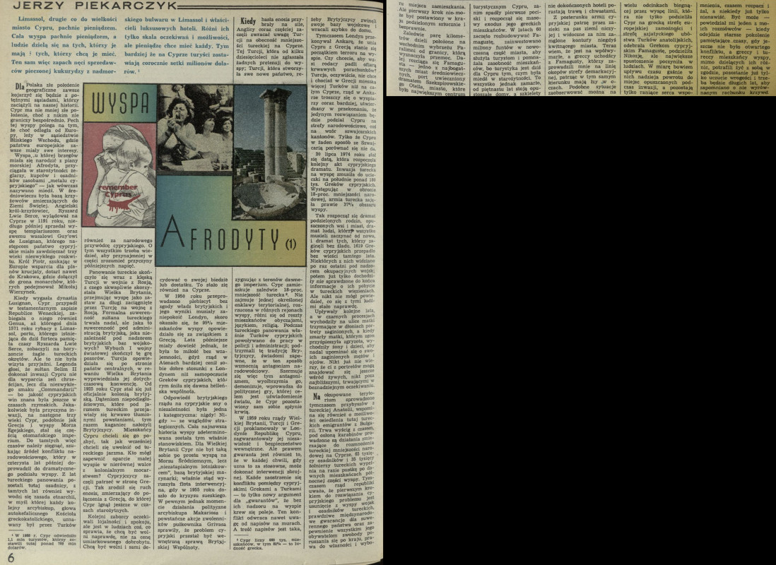 Archiwum / korespondencja własna "Przekroju" nr 2305 (33/1989) 701/19785 Podziel się Tytuł Wyspa Afrodyty (1) Autor Jerzy Piekarczyk Rubryka korespondencja własna "Przekroju" Artykuł z numeru 2305 (33/1989) Data wydania 27 sierpnia 1989 Tagi Limassol Cypr