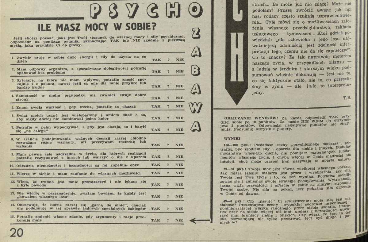 Archiwum / Psychozabawa nr 2305 (33/1989) 23/24 Podziel się Tytuł Psychozabawa: ile masz mocy w sobie? Rubryka Psychozabawa Artykuł z numeru 2305 (33/1989) Data wydania 27 sierpnia 1989 Tagi psychozabawa quz test