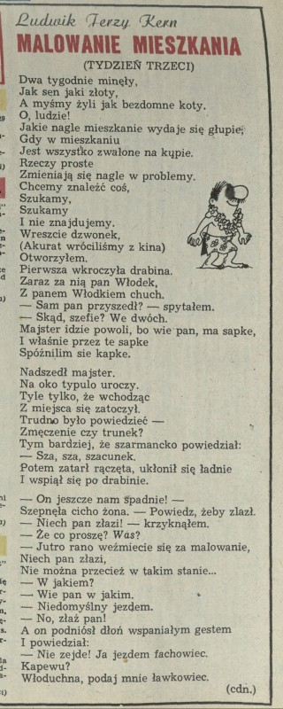 Archiwum / Rozmaitości [old] nr 2306 (34/1989) 3/5 Podziel się Tytuł Malowanie mieszkania Autor Ludwik Jerzy Kern Rubryka Rozmaitości [old] Artykuł z numeru 2306 (34/1989) Data wydania 3 września 1989 Tagi Ludwik Jerzy Kern poezja