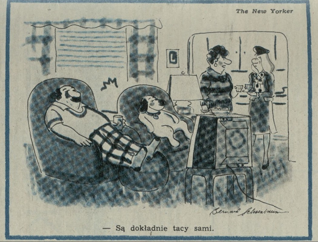 Archiwum / Historyjki obrazkowe nr 2306 (34/1989) 94997/123969 Podziel się Tytuł [Rysunek] Kategoria Historyjki obrazkowe Artykuł z numeru 2306 (34/1989) Data wydania 3 września 1989 Tagi The New Yorker