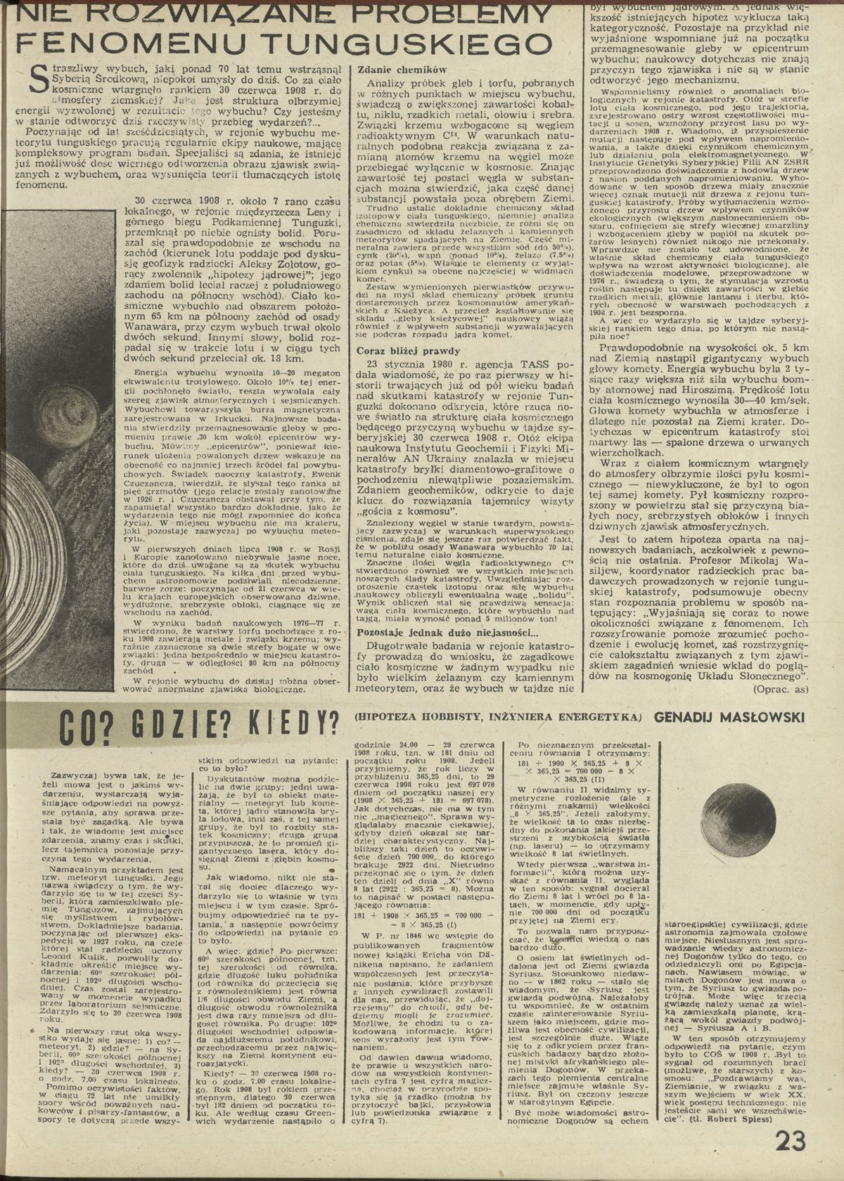 Archiwum / Nauka nr 1851 (39/1980) 29/37 Podziel się Tytuł Nie rozwiązane problemy fenomenu tunguskiego Autor as Kategoria Nauka Artykuł z numeru 1851 (39/1980) Data wydania 28 września 1980