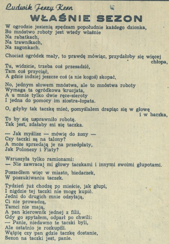Archiwum / Rozmaitości nr 1852 (40/1980) 12/251 Podziel się Tytuł Właśnie sezon Autor Ludwik Jerzy Kern Rubryka Rozmaitości Artykuł z numeru 1852 (40/1980) Data wydania 5 października 1980 Tagi wiersz taczka wykopki jesień
