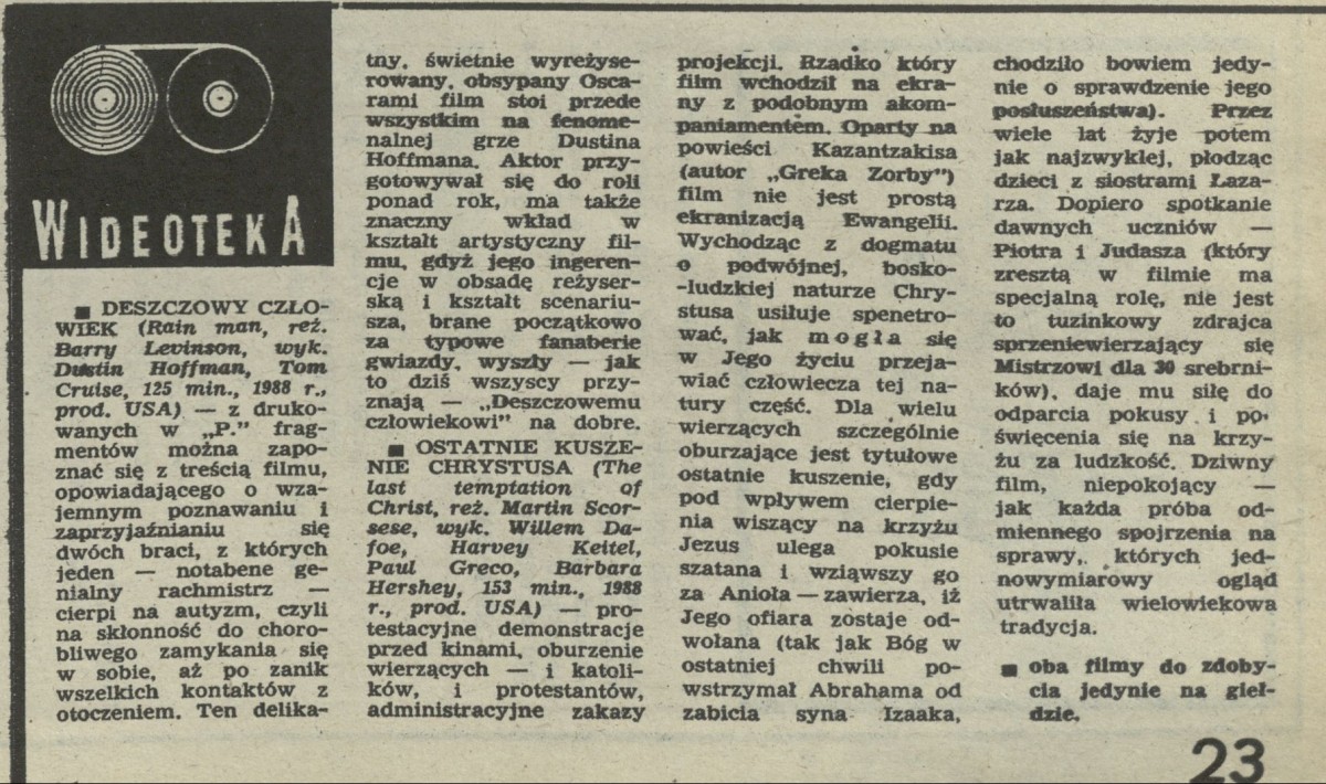 Archiwum / Różności nr 2308 (36/1989) 09/23 Podziel się Tytuł Wideoteka Kategoria Różności Artykuł z numeru 2308 (36/1989) Data wydania 17 września 1989 Tagi Deszczowy człowiek Ostatnie kuszenie Chrystusa