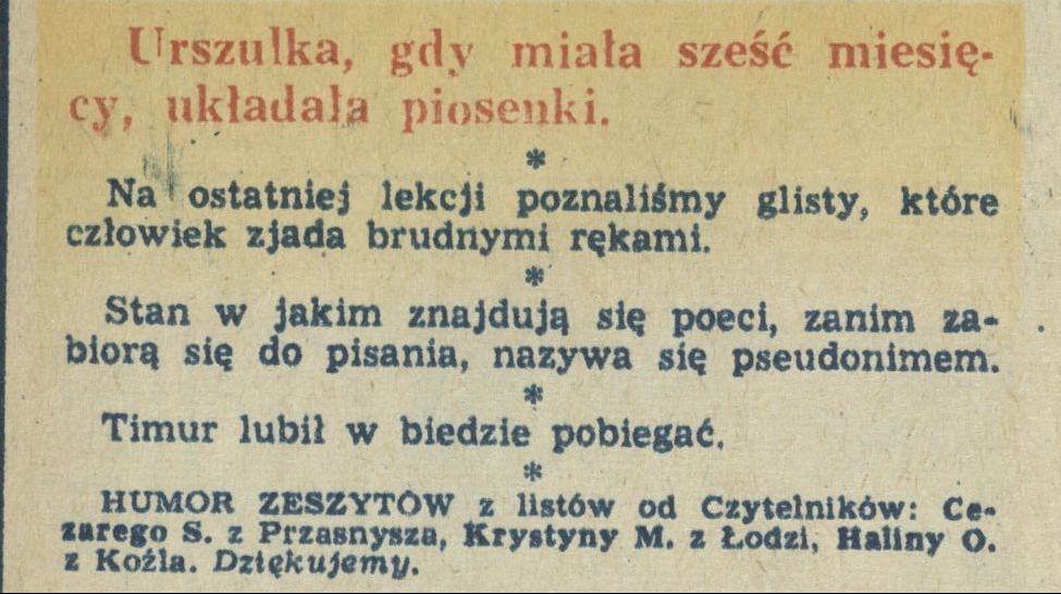 Archiwum / Humor zeszytów szkolnych nr 1856 (44/1980) 353/369 Podziel się Tytuł Humor zeszytów Rubryka Humor zeszytów szkolnych Artykuł z numeru 1856 (44/1980) Data wydania 2 listopada 1980 Tagi Urszulka pseudonim