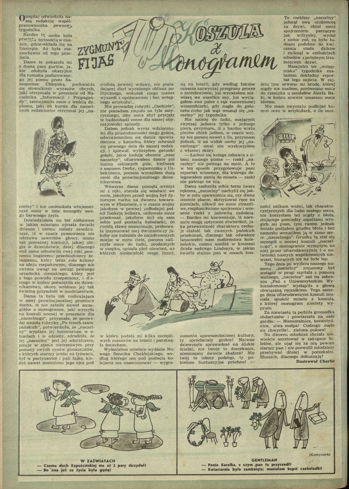 Archiwum nr 56 (18/1946) 16/16 Podziel się Tytuł Koszula z Monogramem Autor Zygmunt Fijas Artykuł z numeru 56 (18/1946) Data wydania 5 maja 1946
