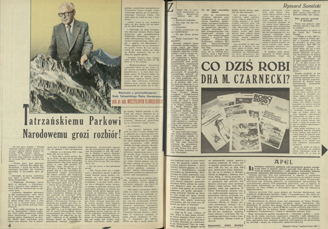 Archiwum / Wywiad nr 1953 (39/1982) 09/20 Podziel się Tytuł Tatrzańskiemu Parkowi Narodowemu grozi rozbiór! Autor Anna Wcisło Kategoria Wywiad Artykuł z numeru 1953 (39/1982) Data wydania 14 listopada 1982 Tagi Tatry