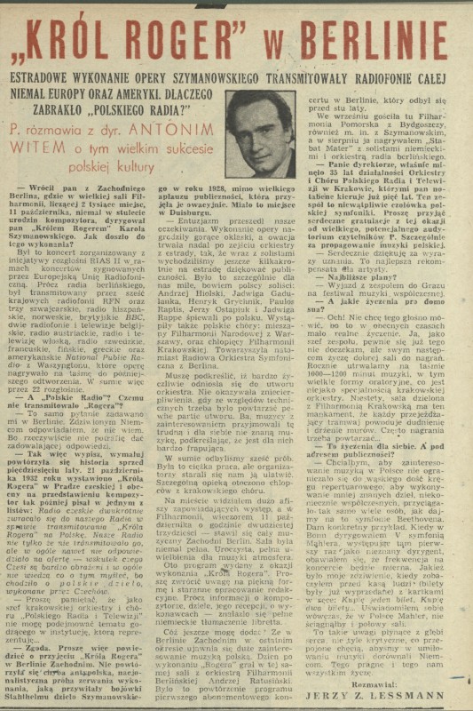 Archiwum / Wywiad nr 1953 (39/1982) 2/2 Podziel się Tytuł „ Król Roger” w Berlinie Autor Jerzy Z. Lessman Kategoria Wywiad Artykuł z numeru 1953 (39/1982) Data wydania 14 listopada 1982 Tagi Antoni Wit