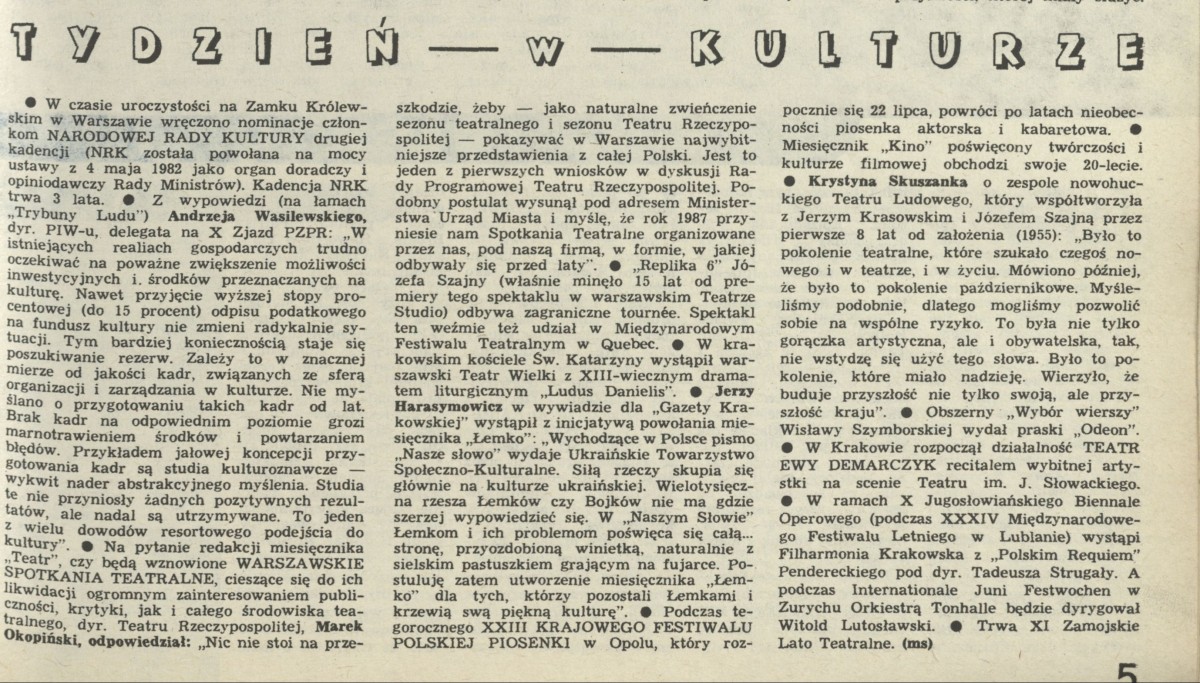 Archiwum / Tydzień w kulturze nr 2141 (25/1986) 14/36 Podziel się Tytuł Tydzień w kulturze Autor ms Rubryka Tydzień w kulturze Artykuł z numeru 2141 (25/1986) Data wydania 22 czerwca 1986