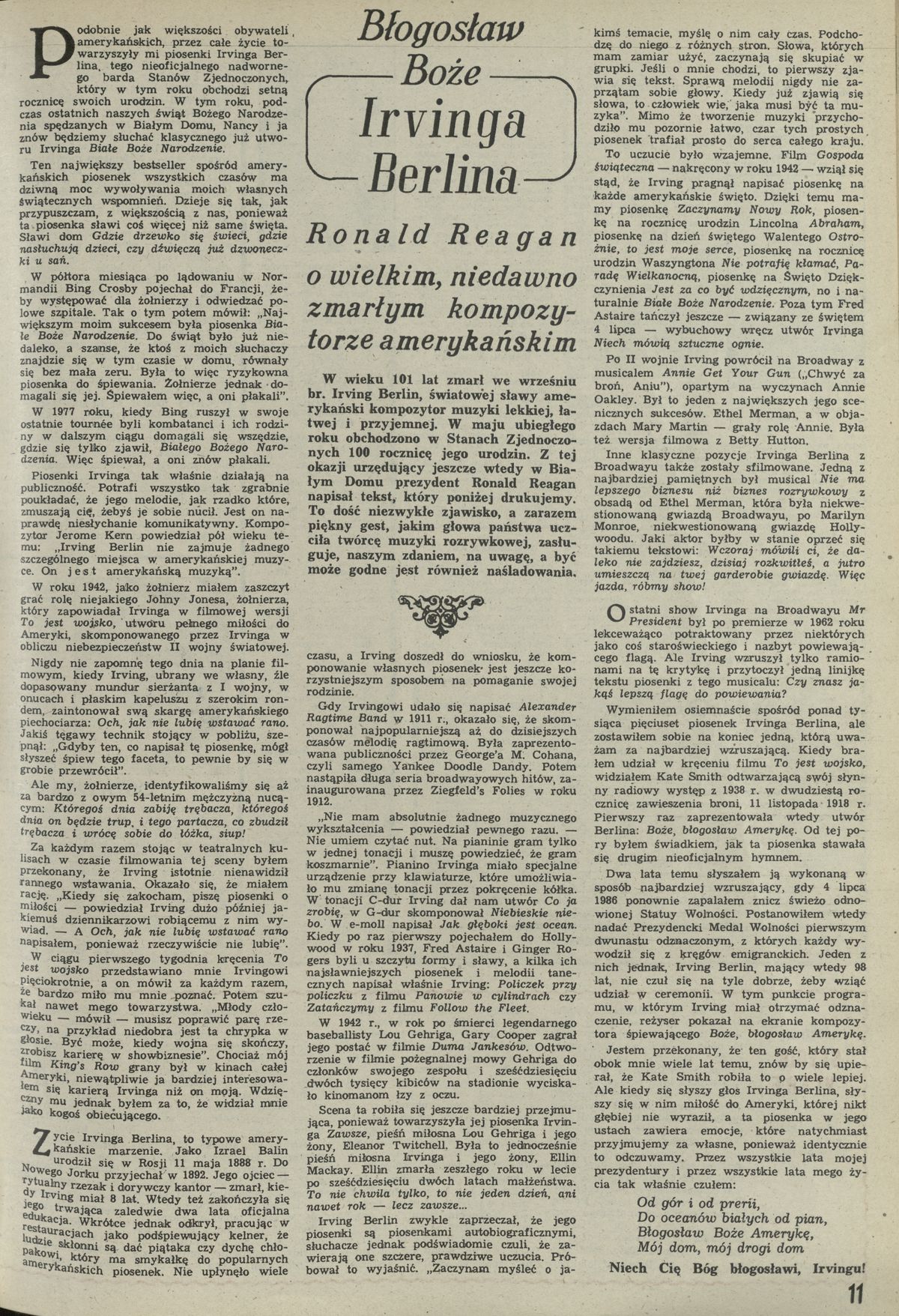 Archiwum / Relacja nr 2312 (40/1989) 1/2 Podziel się Tytuł Błogosław Boże Irvinga Berlin Autor Ronald Reagan Kategoria Relacja Artykuł z numeru 2312 (40/1989) Data wydania 15 października 1989 Tagi Irving Berlin Ronald Reagan
