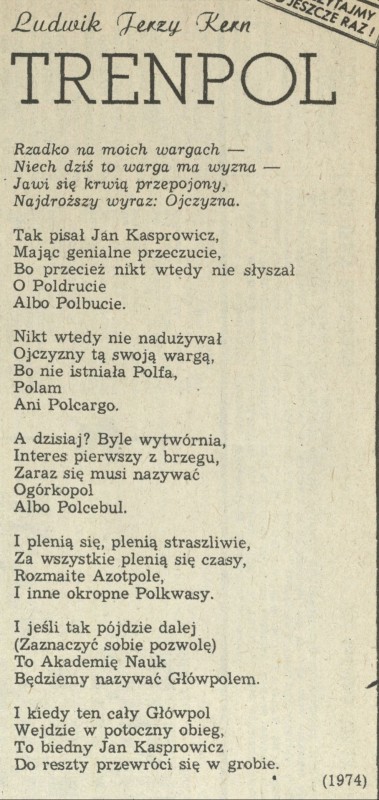 Archiwum / Rozmaitości [old] nr 2169 (01/1987) 298/408 Podziel się Tytuł Trenpol Autor Ludwik Jerzy Kern Rubryka Rozmaitości [old] Artykuł z numeru 2169 (1/1987) Data wydania 4 stycznia 1987