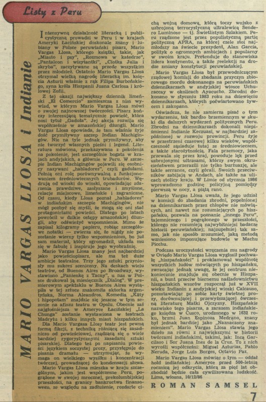 Archiwum / Artykuł nr 2171 (03/1987) 21/231 Podziel się Tytuł Mario Vargas Llosa i Indianie Autor Roman Samsel Kategoria Artykuł Artykuł z numeru 2171 (3/1987) Data wydania 18 stycznia 1987 Tagi Peru podróż