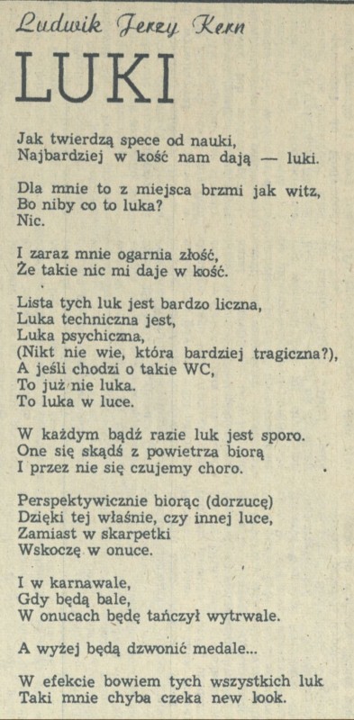 Archiwum / Rozmaitości [old] nr 2171 (03/1987) 43/385 Podziel się Tytuł Luki Autor Ludwik Jerzy Kern Rubryka Rozmaitości [old] Artykuł z numeru 2171 (3/1987) Data wydania 18 stycznia 1987