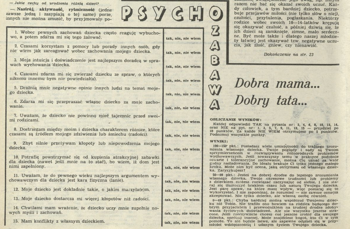 Archiwum / Psychozabawa nr 2138 (22/1986) 5/6 Podziel się Tytuł Psychozabawa: Dobra mama, dobry tata Rubryka Psychozabawa Artykuł z numeru 2138 (22/1986) Data wydania 1 czerwca 1986 Tagi psychologia test quiz rodzice dobry tata mama