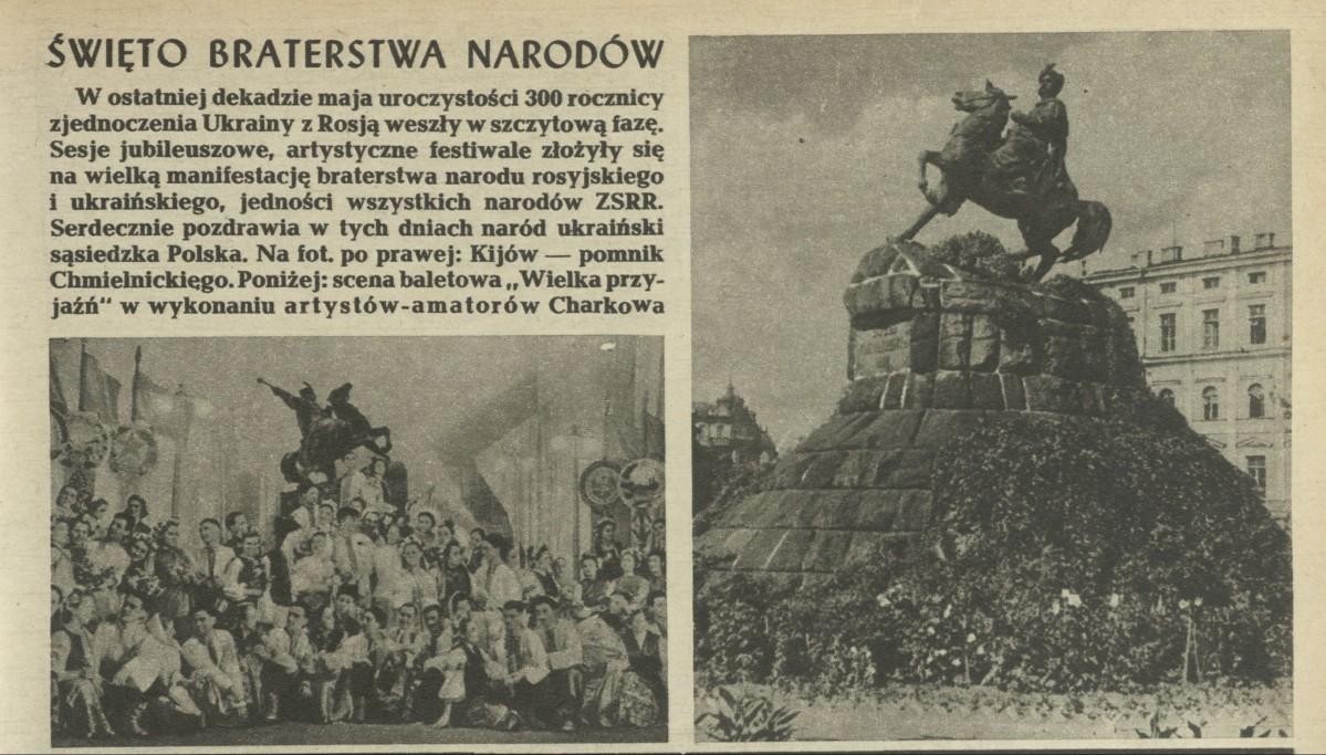 Archiwum / Fotografia nr 477 (22/1954) 17555/123969 Podziel się Tytuł Święto braterstwa narodów Kategoria Fotografia Artykuł z numeru 477 (22/1954) Data wydania 30 maja 1954 Tagi Ukraina Rosja Chmielecki