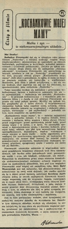 Archiwum / Listy o filmie nr 2139 (23/1986) 87670/123969 Podziel się Tytuł Listy o filmie Autor Aleksandra Rubryka Listy o filmie Artykuł z numeru 2139 (23/1986) Data wydania 8 czerwca 1986 Tagi Kochankowie mojej mamy