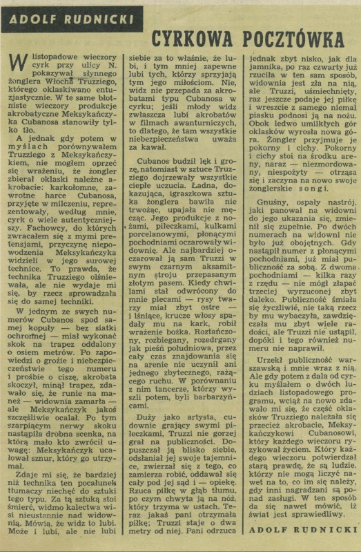 Archiwum / Opowiadanie nr 477 (22/1954) 17559/123969 Podziel się Tytuł Cyrkowa pocztówka Autor Adolf Rudnicki Kategoria Opowiadanie Artykuł z numeru 477 (22/1954) Data wydania 30 maja 1954