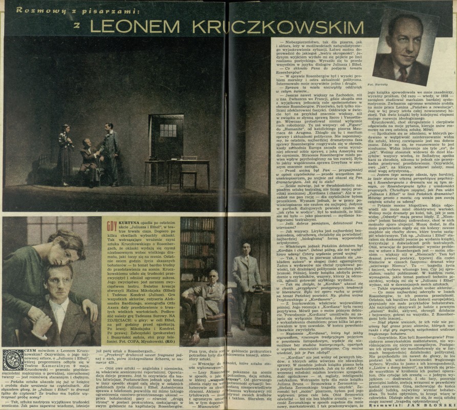 Archiwum / Rozmowy „Przekroju” nr 477 (22/1954) 24/80 Podziel się Tytuł Rozmowy z pisarzami: z Leonem Kruczkowskim Autor Jan Błoński Rubryka Rozmowy „Przekroju” Artykuł z numeru 477 (22/1954) Data wydania 30 maja 1954 Tagi "Juliusz i Ethel" teatr
