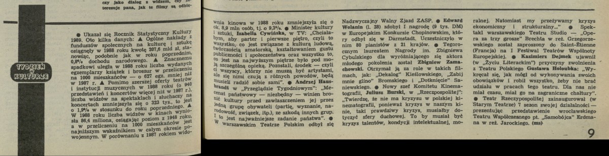 Archiwum / Tydzień w kulturze nr 2315 (43/1989) 40/41 Podziel się Tytuł Tydzień w kulturze Autor ms Rubryka Tydzień w kulturze Artykuł z numeru 2315 (43/1989) Data wydania 5 listopada 1989 Tagi Rocznik Statystyczny Kultury Izabella Cywińska Andrzej Hausbrandt