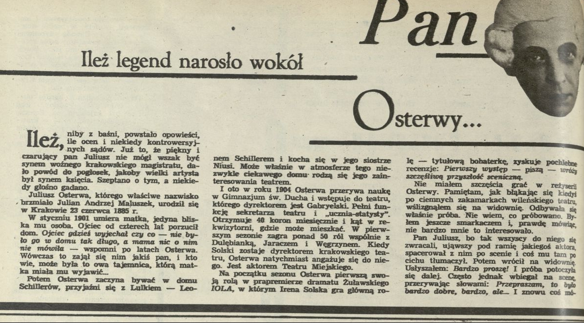 Archiwum / Kultura nr 2188 (20/1987) 34153/123969 Podziel się Tytuł Pan Juliusz. Ileż legend narosło wokół Osterwy... Autor Igor Śmiałkowski Kategoria Kultura Artykuł z numeru 2188 (20/1987) Data wydania 17 maja 1987