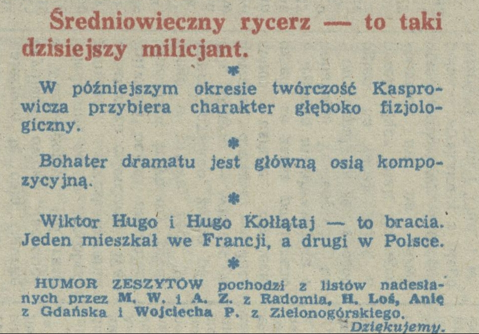 Archiwum / Humor zeszytów szkolnych nr 2315 (43/1989) 312/19785 Podziel się Tytuł Humor zeszytów Rubryka Humor zeszytów szkolnych Artykuł z numeru 2315 (43/1989) Data wydania 5 listopada 1989 Tagi humor zeszytów