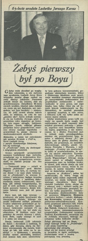 Archiwum / Relacja nr 2173 (05/1987) 13/13 Podziel się Tytuł Żebyś był pierwszy po Boyu Kategoria Relacja Artykuł z numeru 2173 (5/1987) Data wydania 1 lutego 1987 Tagi Kern 65-lecie