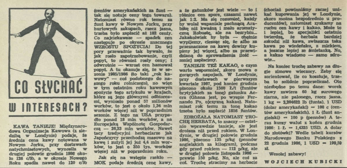 Archiwum / Relacja nr 2173 (05/1987) 02/11 Podziel się Tytuł Co słychać w interesach? Autor Wojciech Kubicki Kategoria Relacja Artykuł z numeru 2173 (5/1987) Data wydania 1 lutego 1987 Tagi kawa herbata
