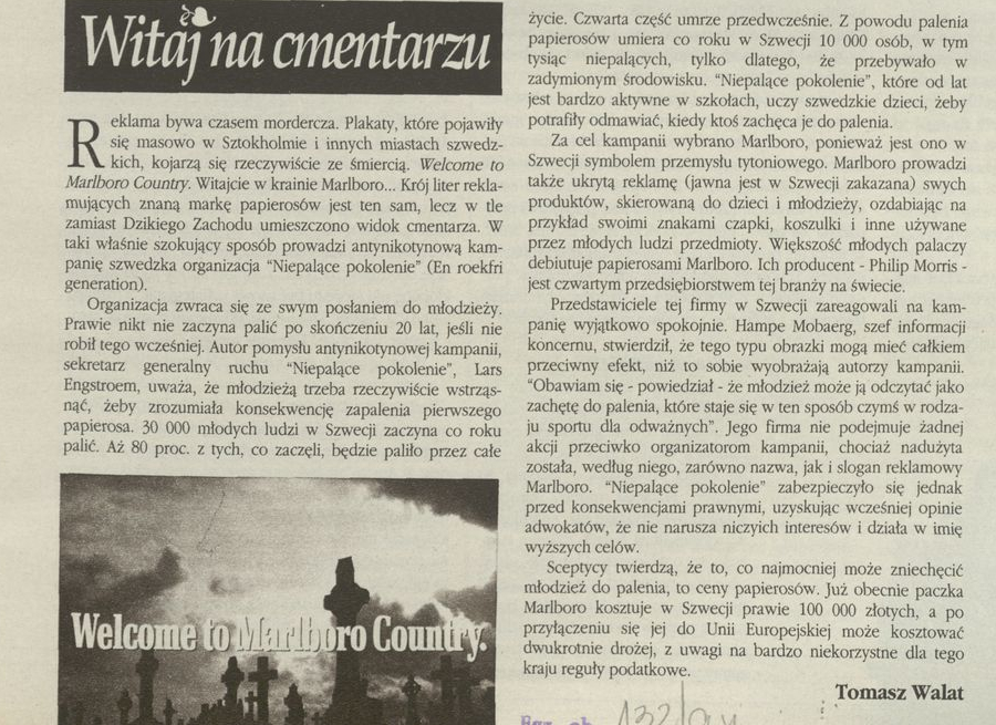 Archiwum / Społeczeństwo nr 2540 (09/1994) 17583/123969 Podziel się Tytuł Witaj na cmentarzu Autor Tomasz Walat Kategoria Społeczeństwo Artykuł z numeru 2540 (9/1994) Data wydania 19 lutego 1994 Tagi Marlboro papierosy reklama