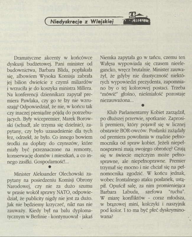 Archiwum / Społeczeństwo nr 2540 (09/1994) 105/235 Podziel się Tytuł Niedyskrecje z Wiejskiej Kategoria Społeczeństwo Artykuł z numeru 2540 (9/1994) Data wydania 19 lutego 1994 Tagi Polityka Barbara Blida Marek Borowski