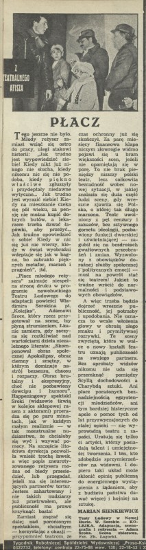 Archiwum / Artykuł nr 2332 (23/1990) 96168/123969 Podziel się Tytuł Płacz Autor Marian Sienkiewicz Kategoria Artykuł Artykuł z numeru 2332 (2333/1990) Data wydania 4 marca 1990 Tagi teatr